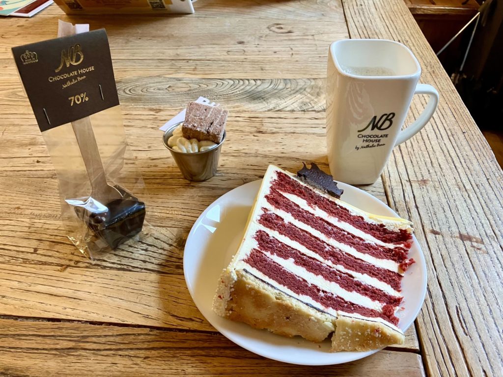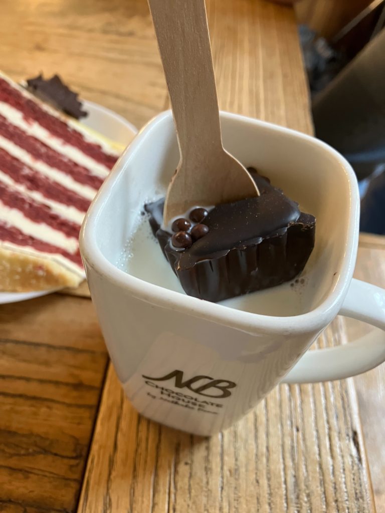 外が寒かったので、ホットチョコレートを飲んだ時はとても幸せだった。ケーキもおいしい。